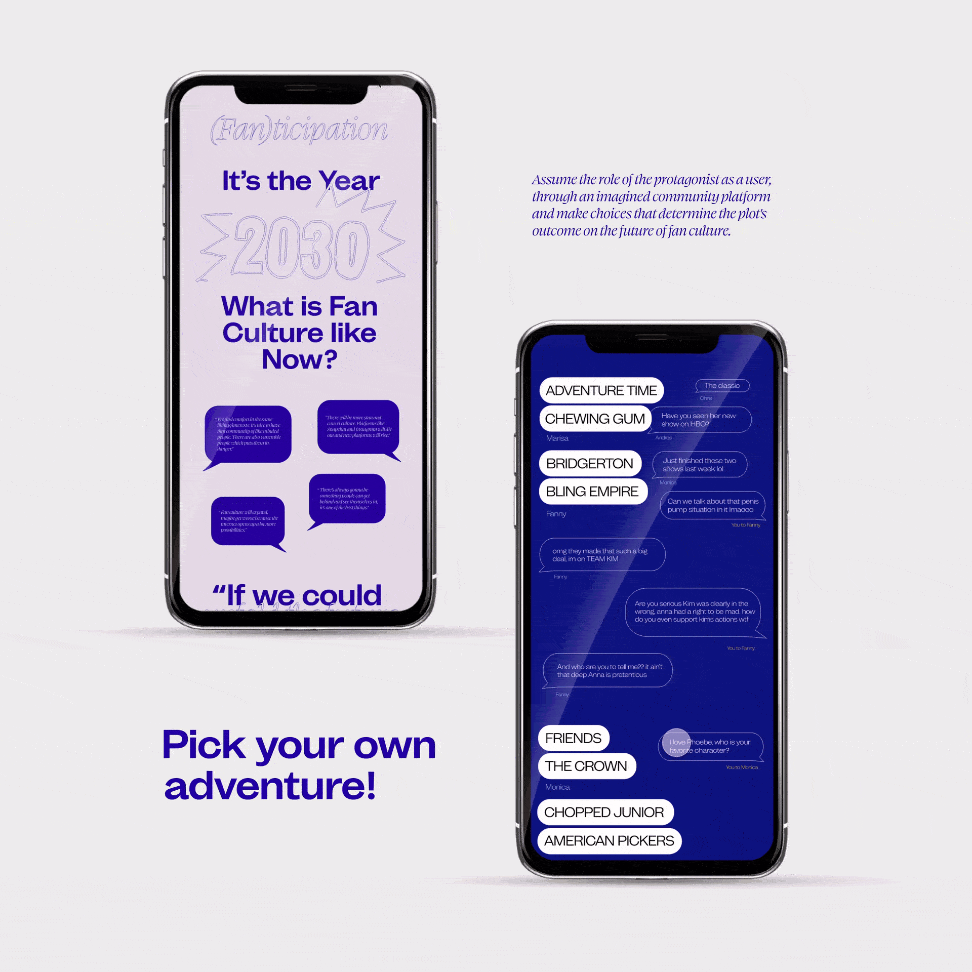 Experience it for yourself through this storytelling piece, (F)anticipation, which enables you to make choices that determine a user’s actions through an imagined community platform. It’s possible that we will continue cancelling and start rating each other on online platforms. Or, it can go in a positive direction, where, rather than cancelling everyone, we will start to do research and educate others with compassion. Whatever it is, it’s ultimately in our hands.